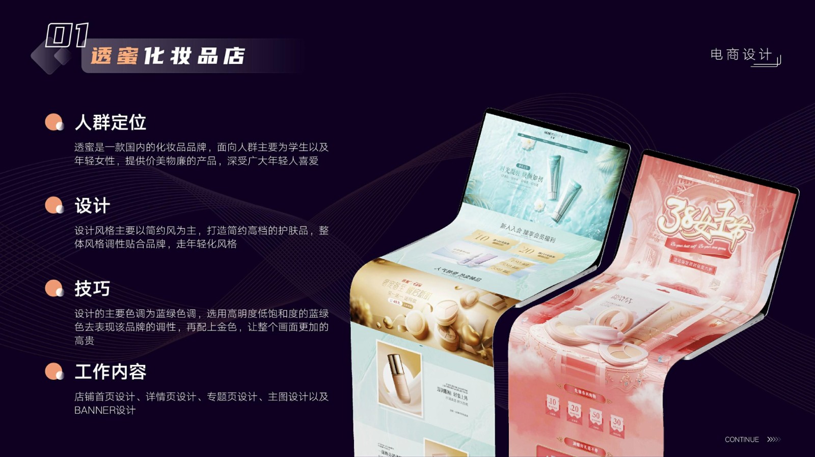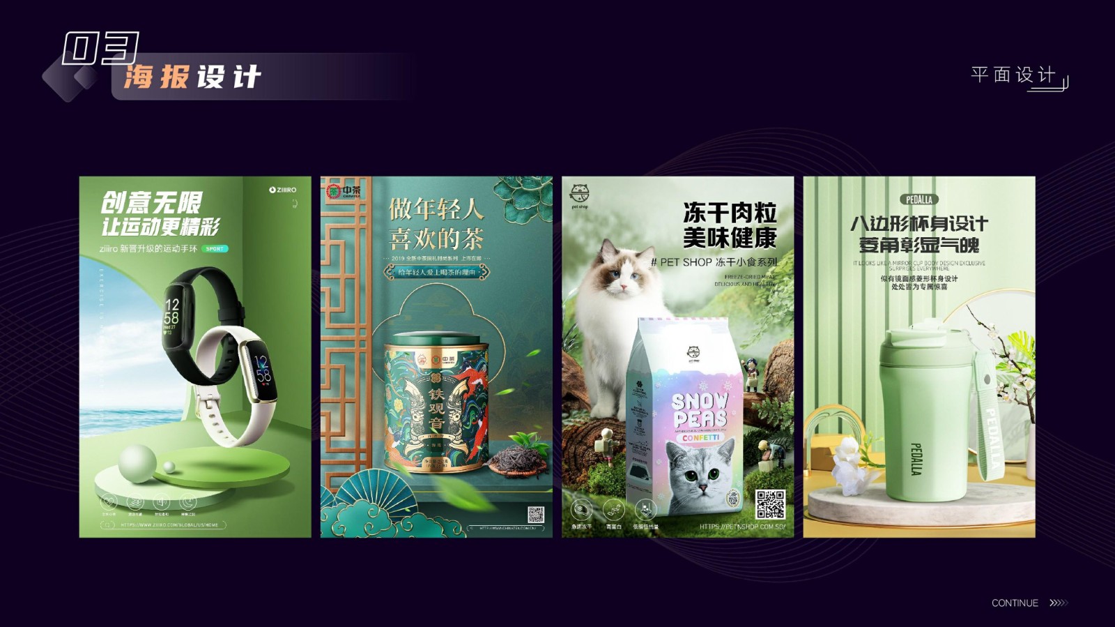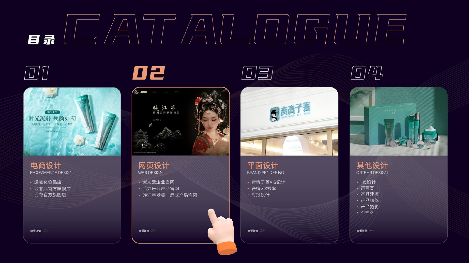 涉及基礎平面設計、品牌VI系統設計、電商店鋪設計及移動端UI設計,強調視覺傳達和交互設計的專業性和技術深度,展示跨領域設計的綜合實力。